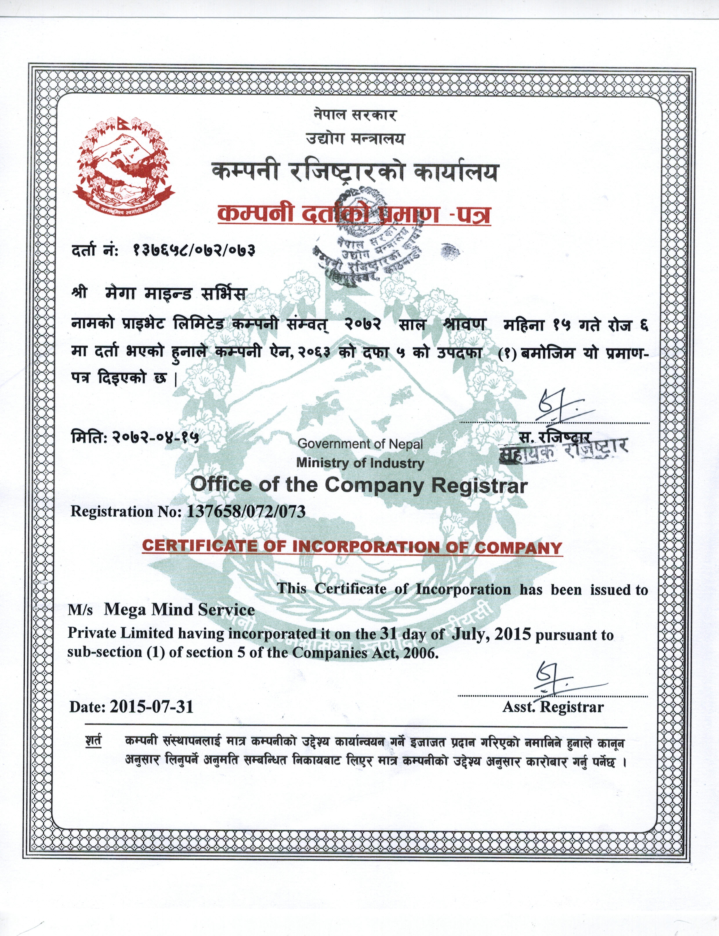 मेगा माइन्ड सर्भिस प्रा.लि. (कम्पनी रजिष्टार कार्यालय) |